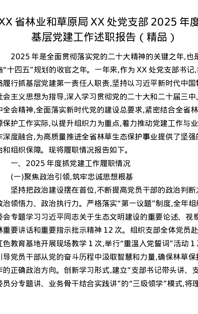 XX省林业和草原局XX处党支部2025年度抓基层党建工作述职报告