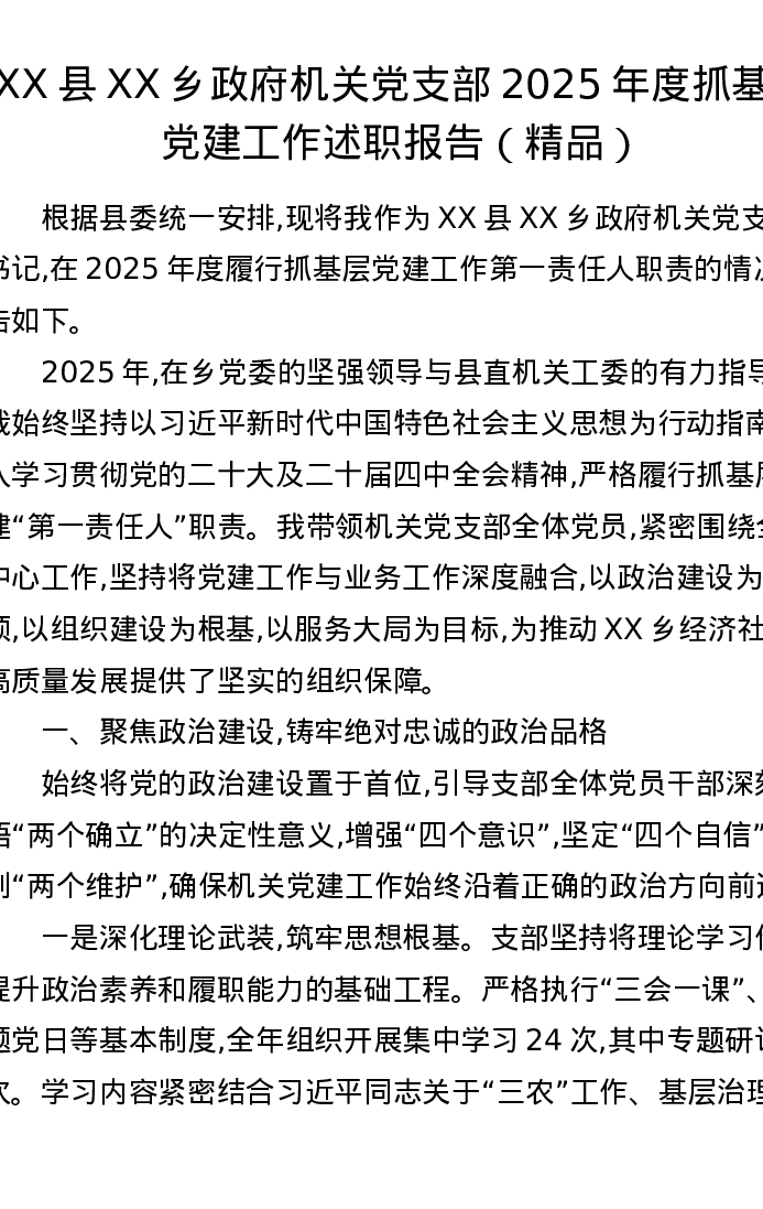 XX县XX乡政府机关党支部2025年度抓基层党建工作述职报告
