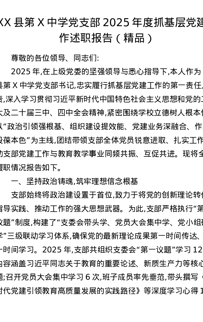 XX县第X中学党支部2025年度抓基层党建工作述职报告