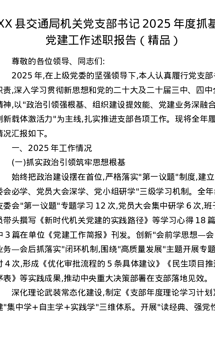 XX县交通局机关党支部书记2025年度抓基层党建工作述职报告