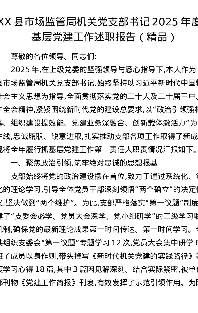 XX县市场监管局机关党支部书记2025年度抓基层党建工作述职报告