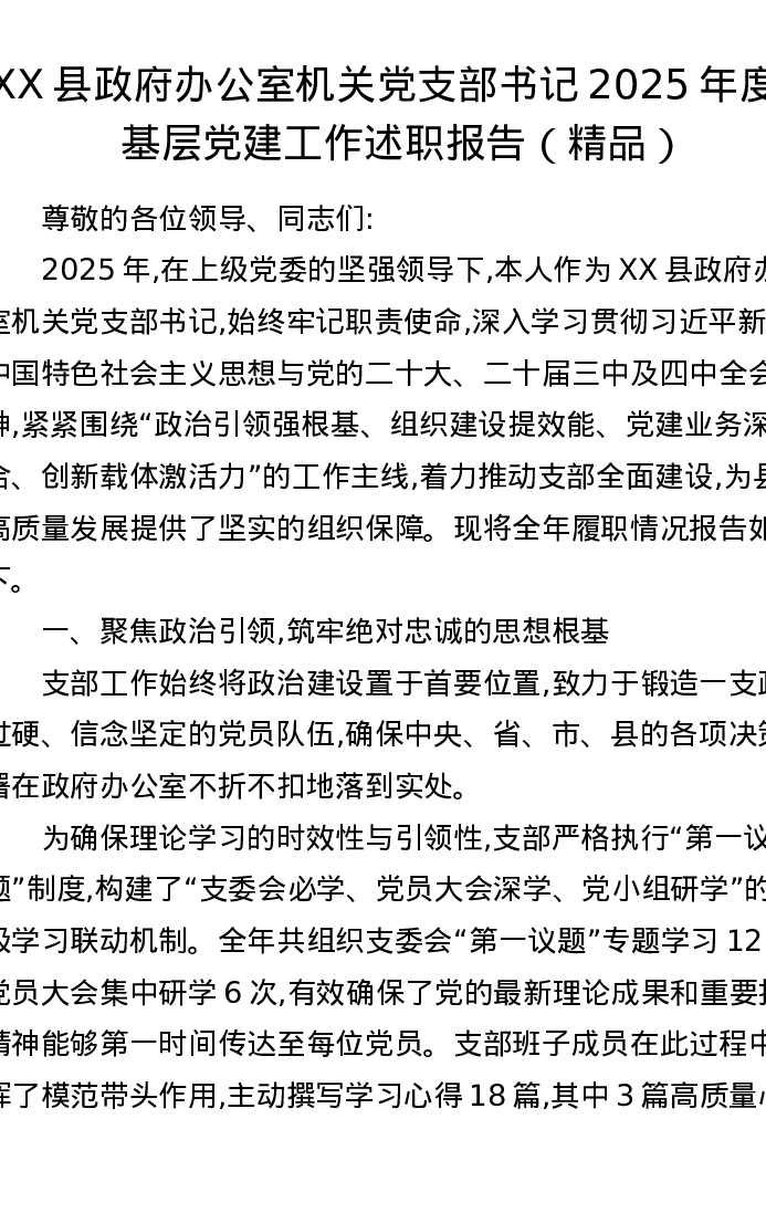 XX县政府办公室机关党支部书记2025年度抓基层党建工作述职报告
