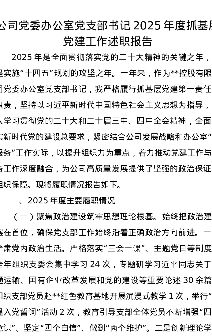 公司党委办公室党支部书记2025年度抓基层党建工作述职报告