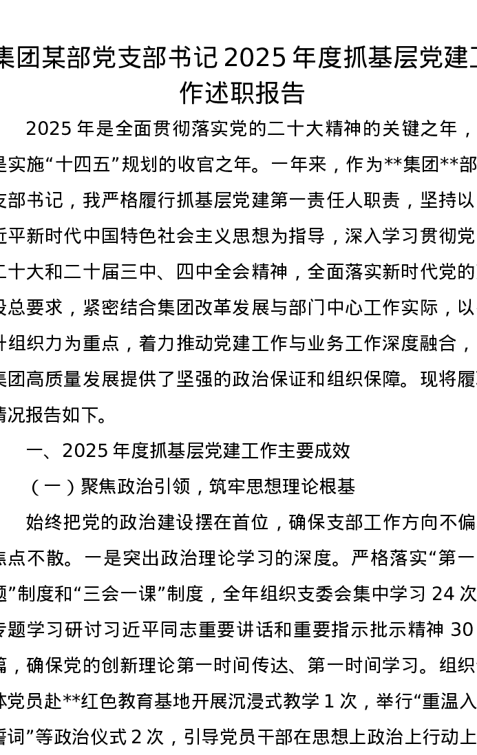 集团某部党支部书记2025年度抓基层党建工作述职报告