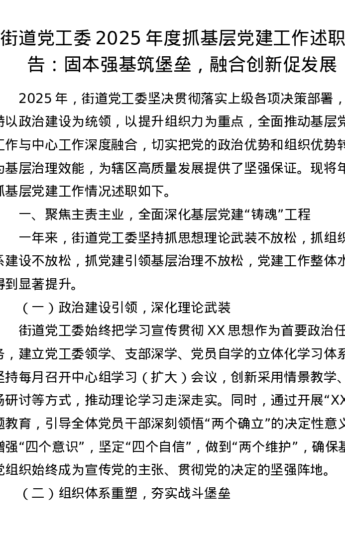 街道党工委2025年度抓基层党建工作述职报告:固本强基筑堡垒,融合创新促发展