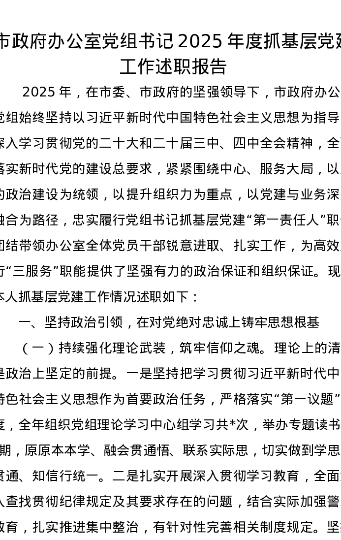 市政府办公室党组书记2025年度抓基层党建工作述职报告