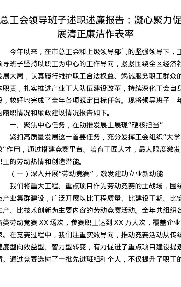 总工会领导班子述职述廉报告:凝心聚力促发展 清正廉洁作表率