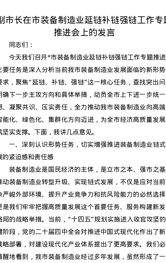副市长在市装备制造业延链补链强链工作专题推进会上的发言