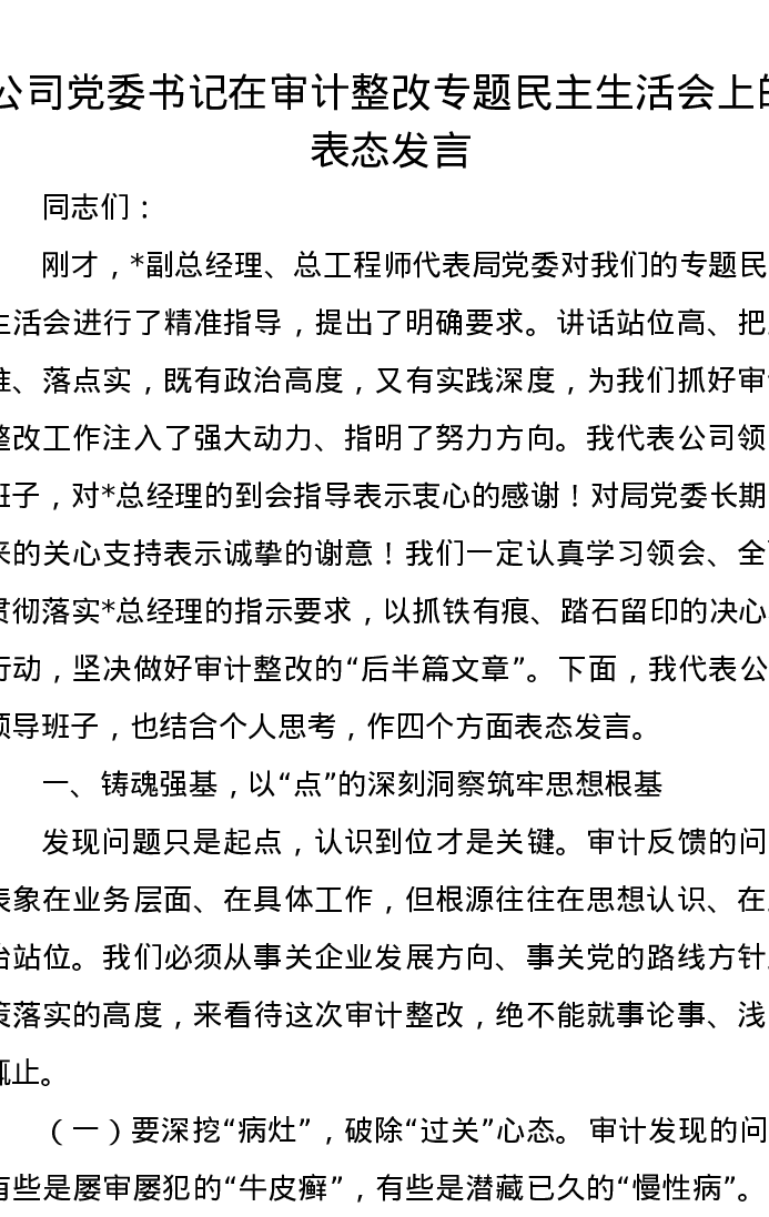 公司党委书记在审计整改专题xxxxx上的表态发言
