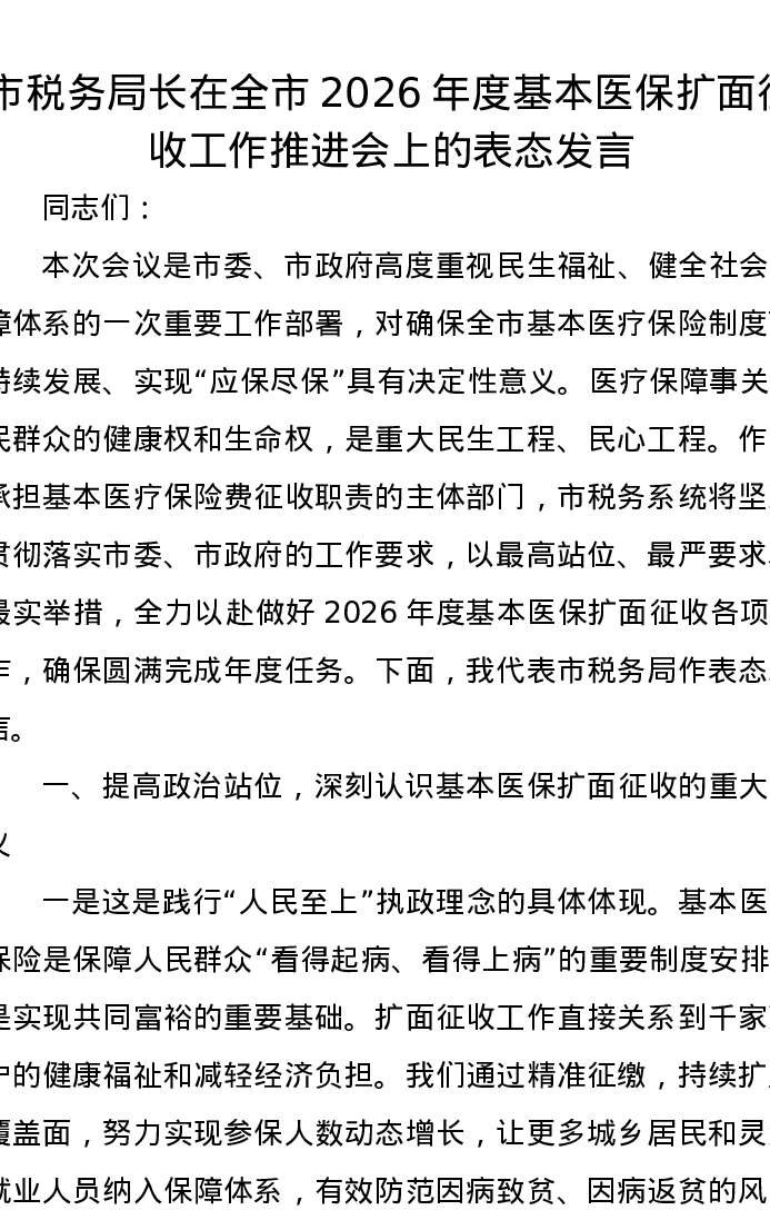 市税务局长在全市2026年度基本医保扩面征收工作推进会上的表态发言