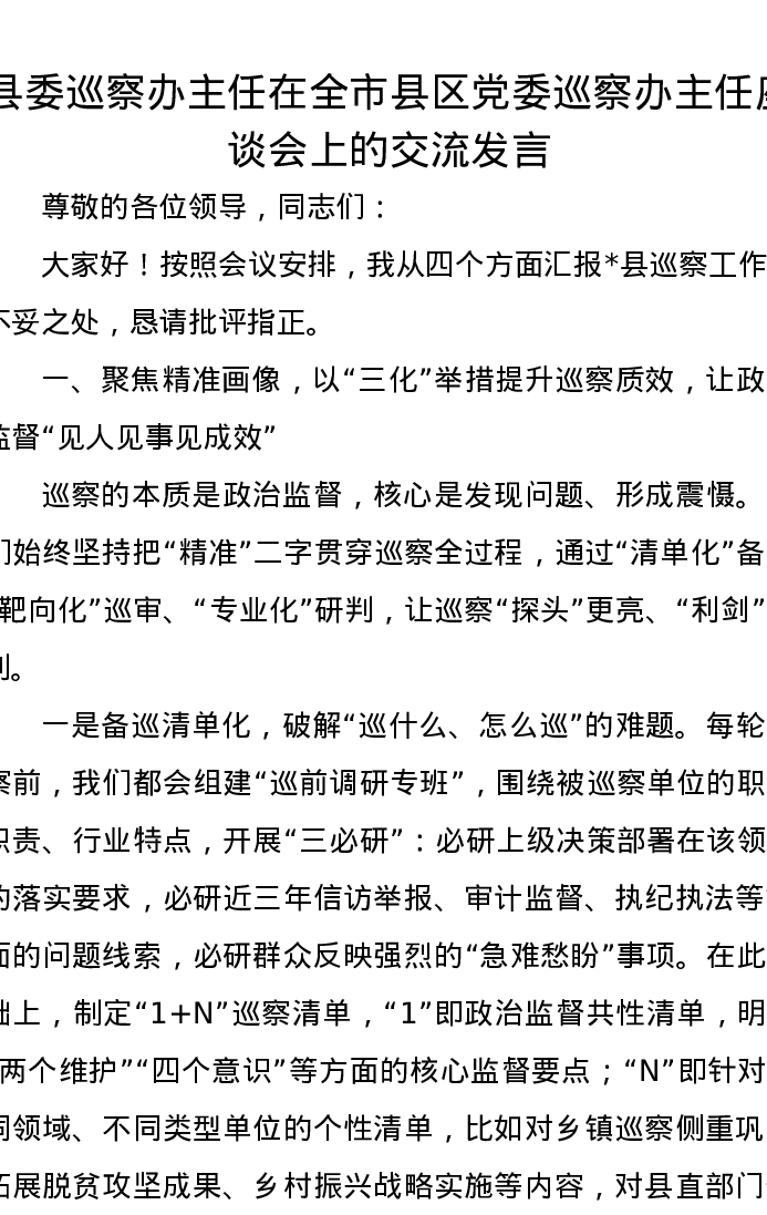 县委巡察办主任在全市县区党委巡察办主任座谈会上的交流发言