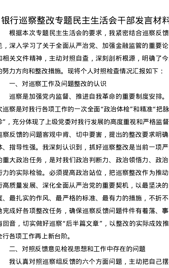 银行巡察整改专题xxxxx干部发言材料
