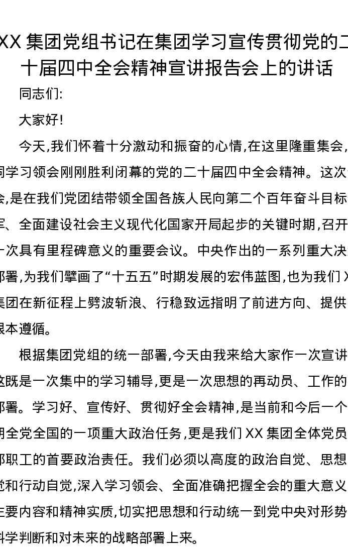 XX集团党组书记在集团学习宣传贯彻党的二十届四中全会精神宣讲报告会上的讲话