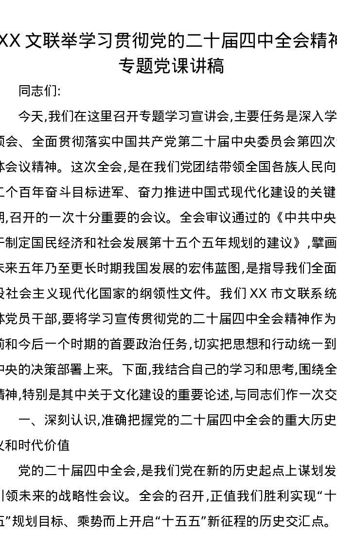 XX文联举学习贯彻党的二十届四中全会精神专题党课讲稿