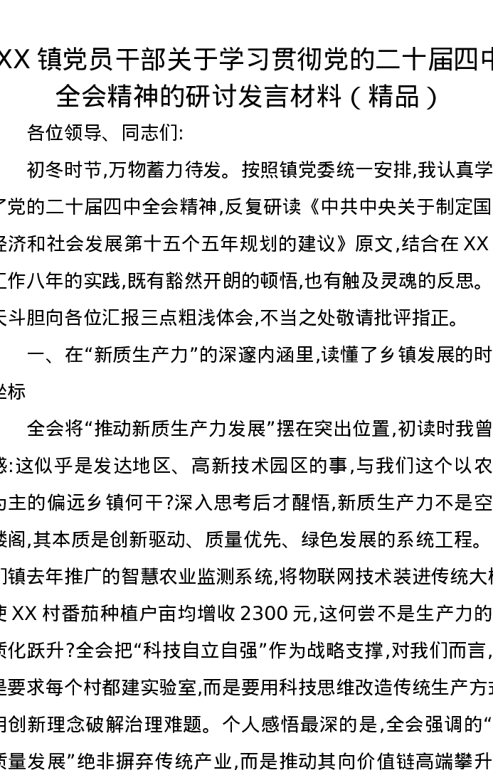 XX镇党员干部关于学习贯彻党的二十届四中全会精神的研讨发言材料(精品)
