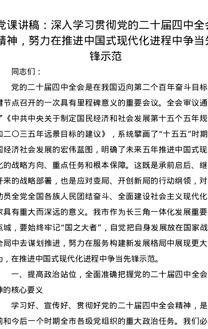 党课讲稿:深入学习贯彻党的二十届四中全会精神,努力在推进中国式现代化进程中争当先锋示范