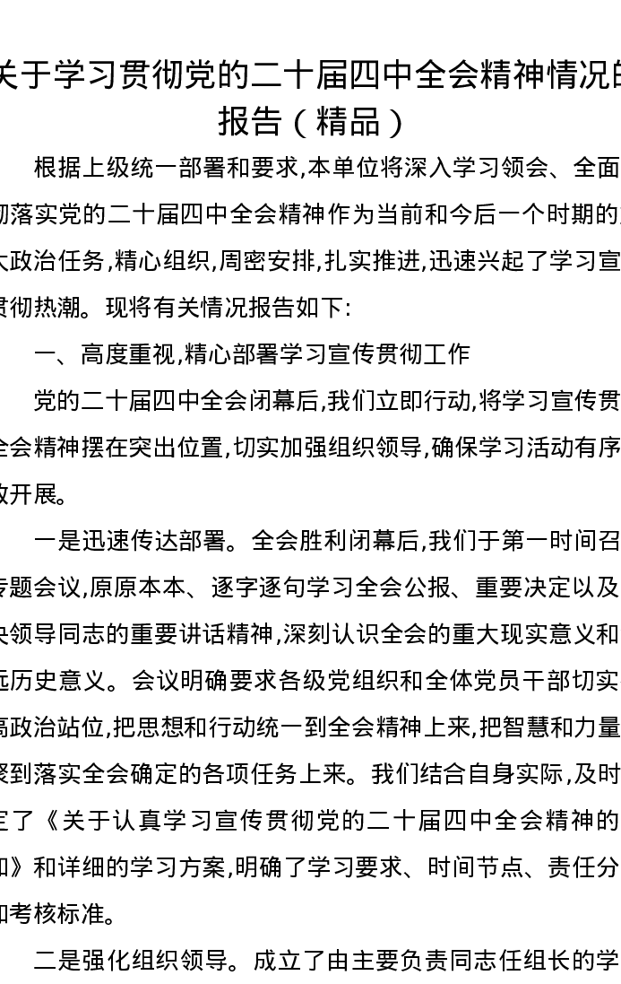 关于学习贯彻党的二十届四中全会精神情况的报告