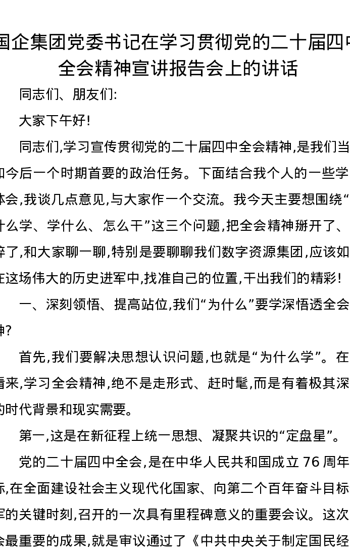 国企集团党委书记在学习贯彻党的二十届四中全会精神宣讲报告会上的讲话
