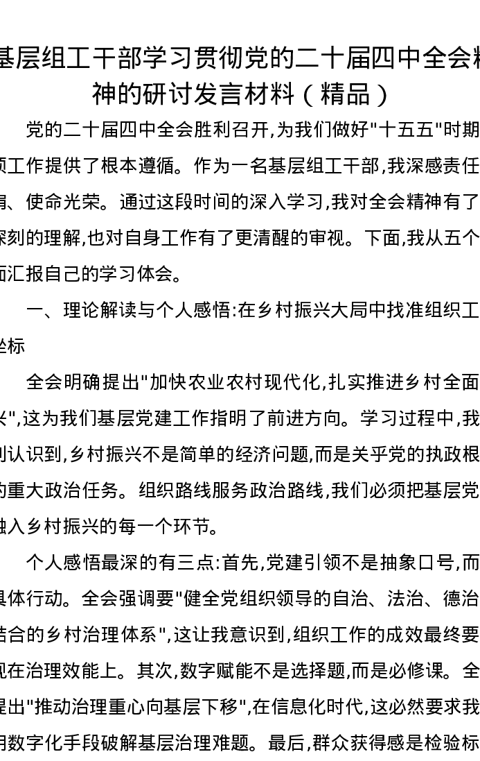 基层组工干部学习贯彻党的二十届四中全会精神的研讨发言材料(精品)