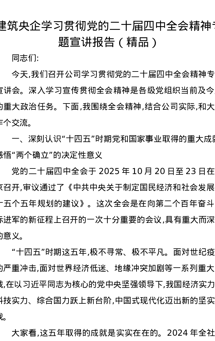 建筑央企学习贯彻党的二十届四中全会精神专题宣讲报告(精品)