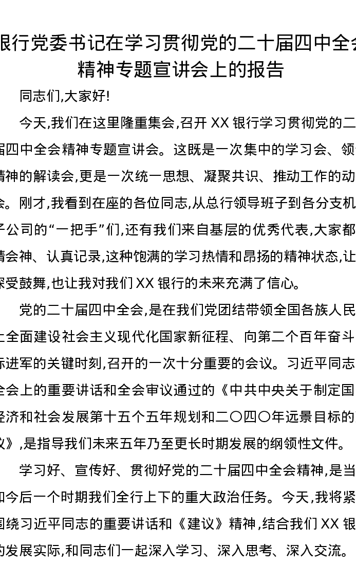 银行党委书记在学习贯彻党的二十届四中全会精神专题宣讲会上的报告
