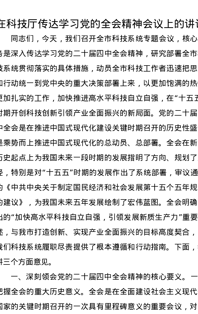 在科技厅传达学习党的二十届四中全会精神会议上的讲话