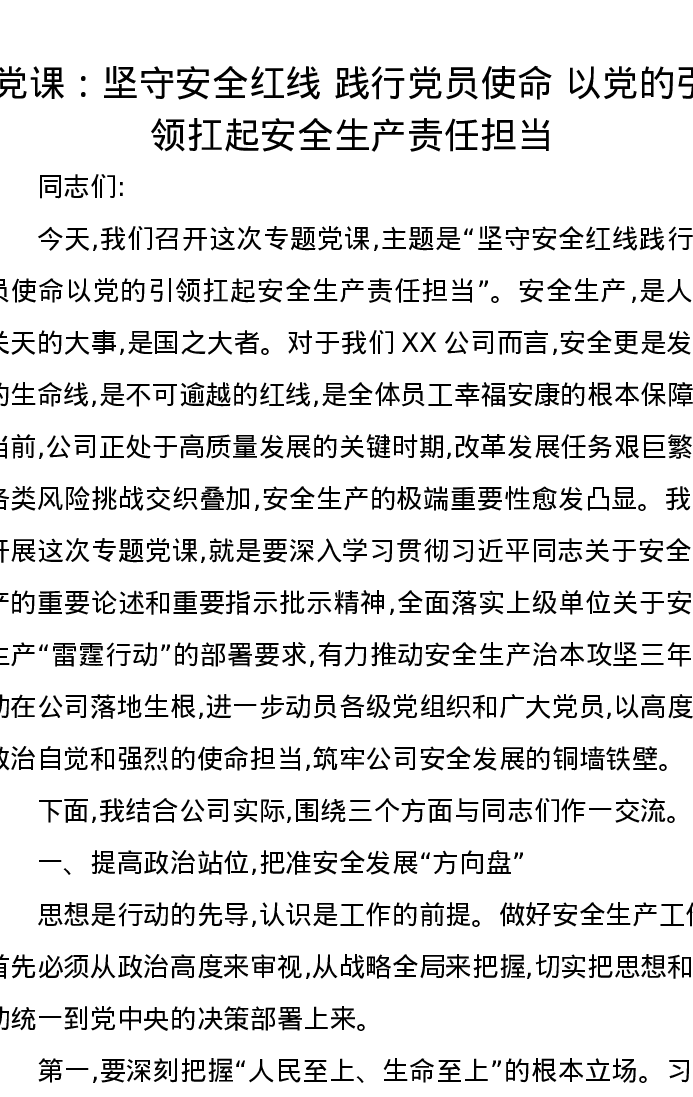 党课讲稿:坚守安全红线 践行党员使命 以党的引领扛起安全生产责任担当