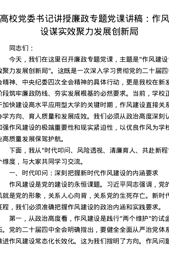 高校党委书记讲授廉政专题党课讲稿:作风建设谋实效聚力发展创新局