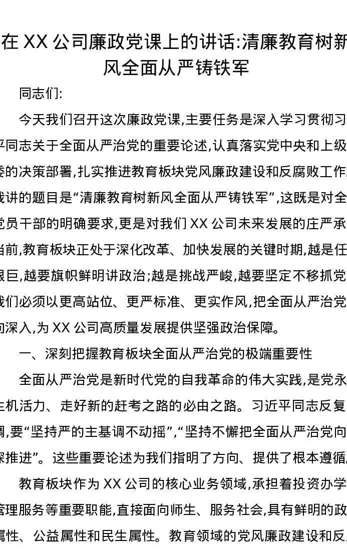 在XX公司廉政党课上的讲话清廉教育树新风全面从严铸铁军