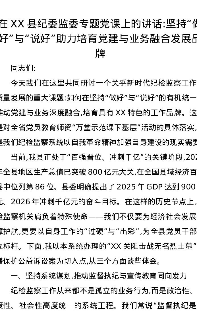 在XX县纪委监委专题党课上的讲话坚持“做好”与“说好”助力培育党建与业务融合发展品牌