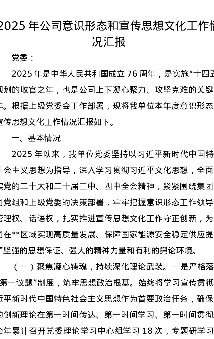 2025年公司意识形态和宣传思想文化工作情况汇报
