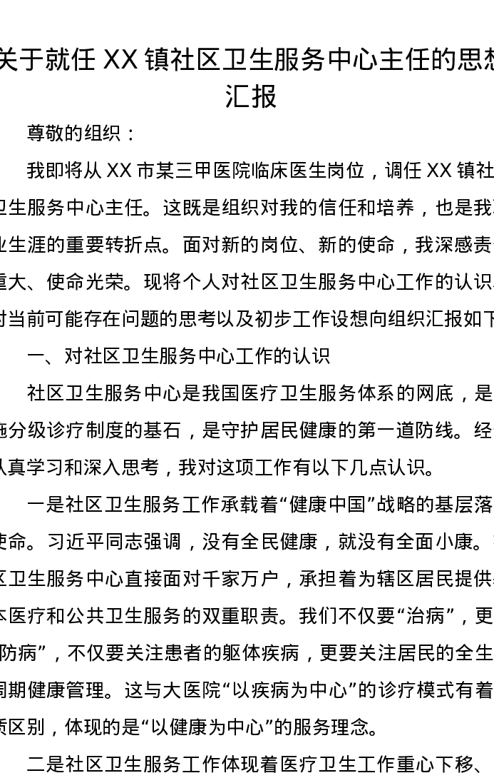 关于就任XX镇社区卫生服务中心主任的思想汇报