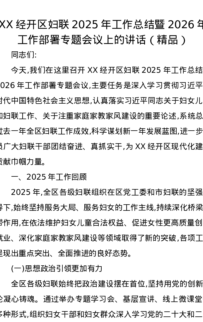 XX经开区妇联2025年工作总结暨2026年工作部署专题会议上的讲话