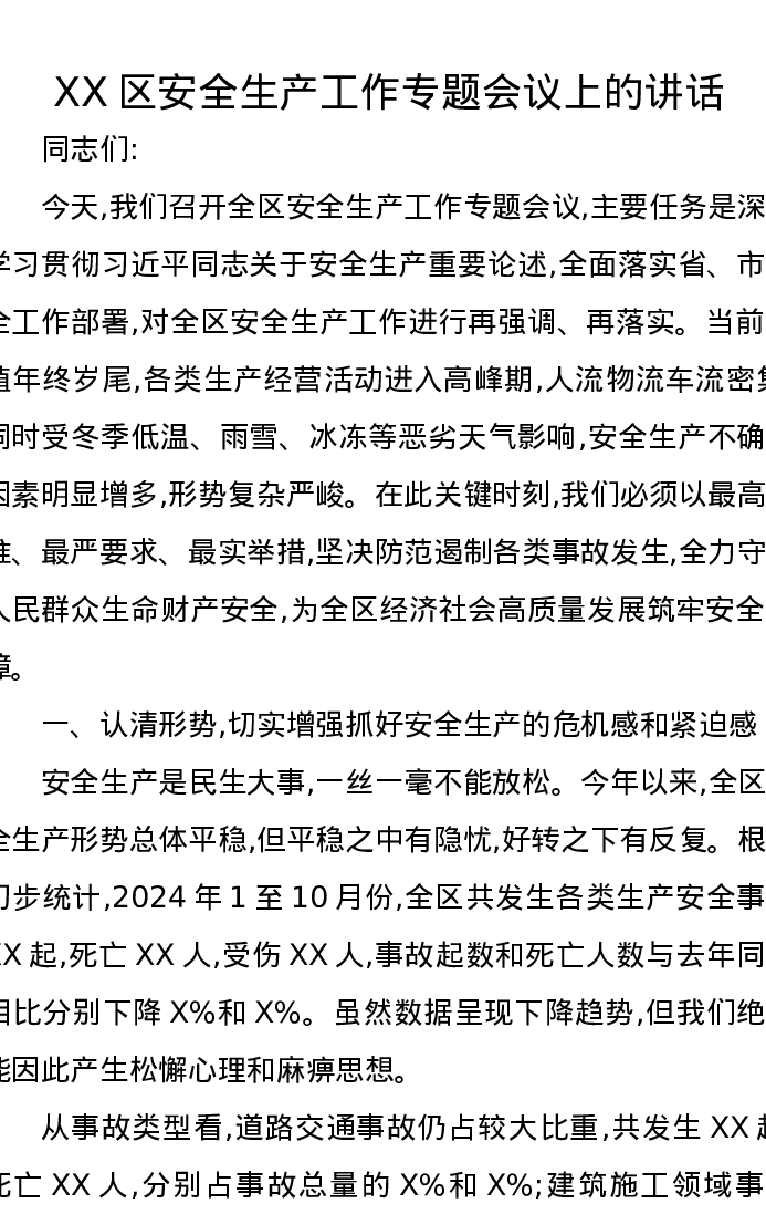 XX区安全生产工作专题会议上的讲话