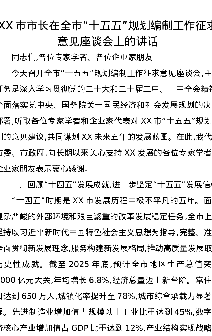 XX市市长在全市“十五五”规划编制工作征求意见座谈会上的讲话