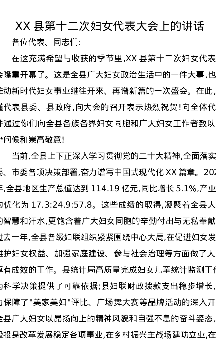 XX县第十二次妇女代表大会上的讲话