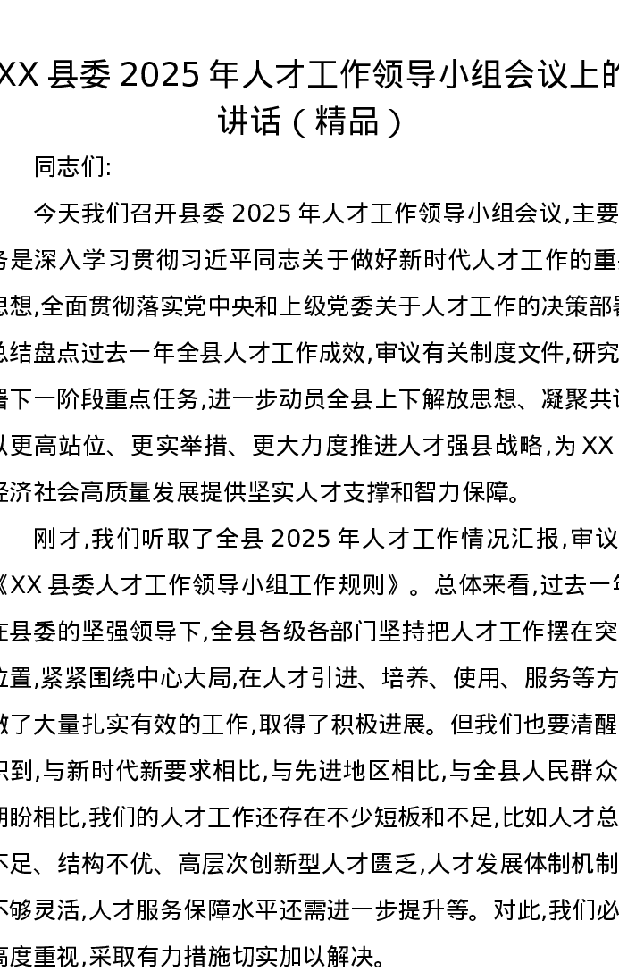 XX县委2025年人才工作领导小组会议上的讲话(精品)