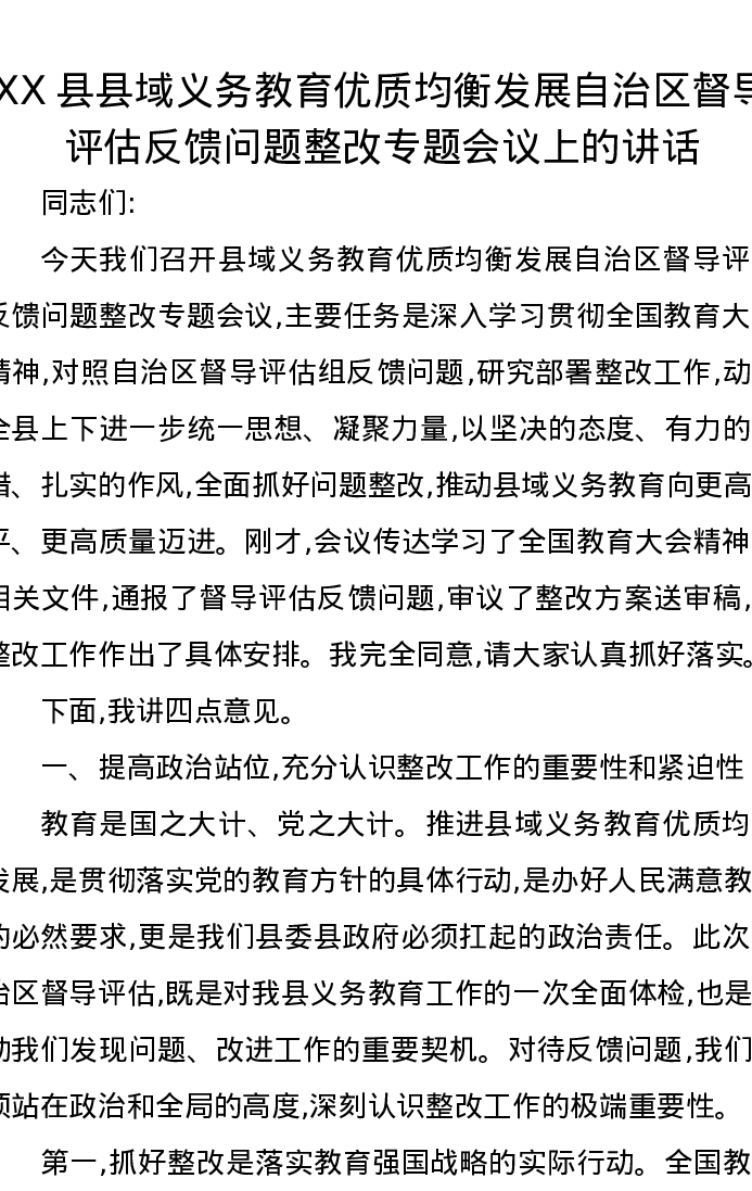XX县县域义务教育优质均衡发展自治区督导评估反馈问题整改专题会议上的讲话
