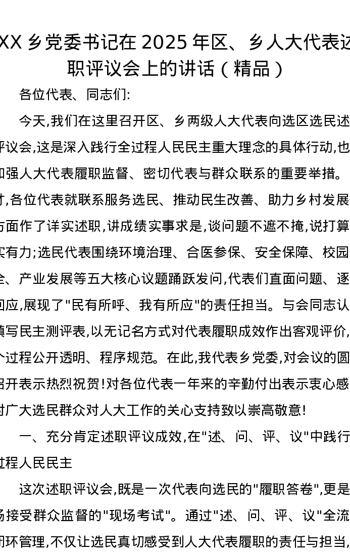 XX乡党委书记在2025年区、乡人大代表述职评议会上的讲话
