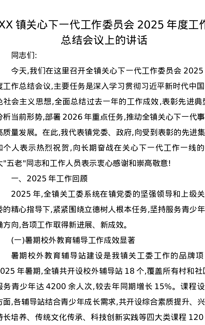 XX镇关心下一代工作委员会2025年度工作总结会议上的讲话