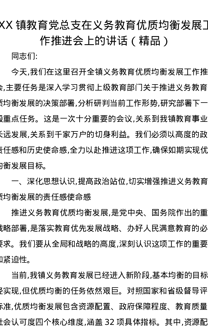 XX镇教育党总支在义务教育优质均衡发展工作推进会上的讲话(精品)