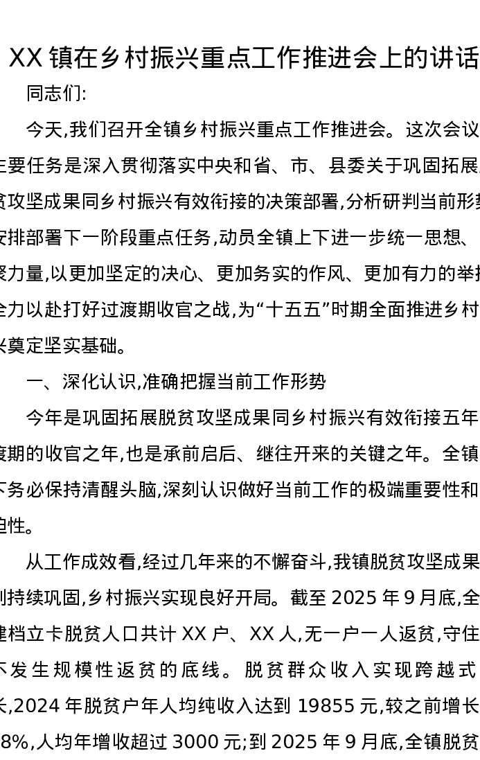 XX镇在乡村振兴重点工作推进会上的讲话