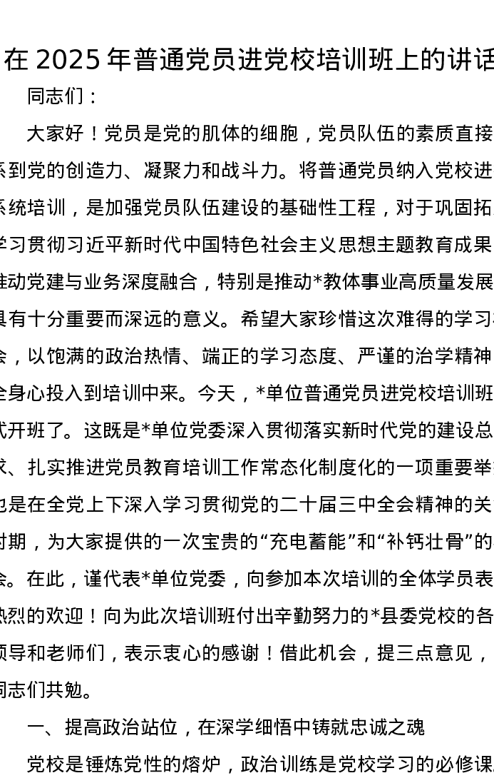 在2025年普通党员进党校培训班上的讲话