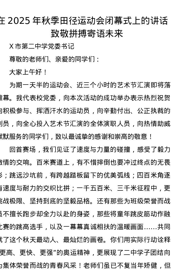 在2025年秋季田径运动会闭幕式上的讲话:致敬拼搏寄语未来