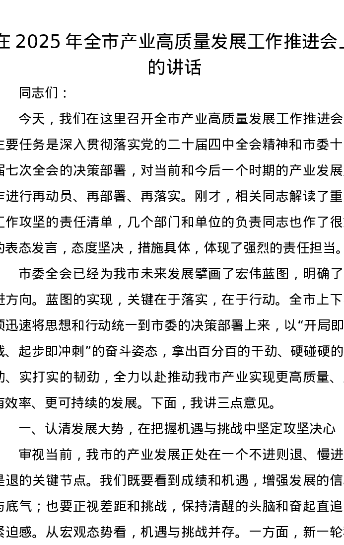 在2025年全市产业高质量发展工作推进会上的讲话