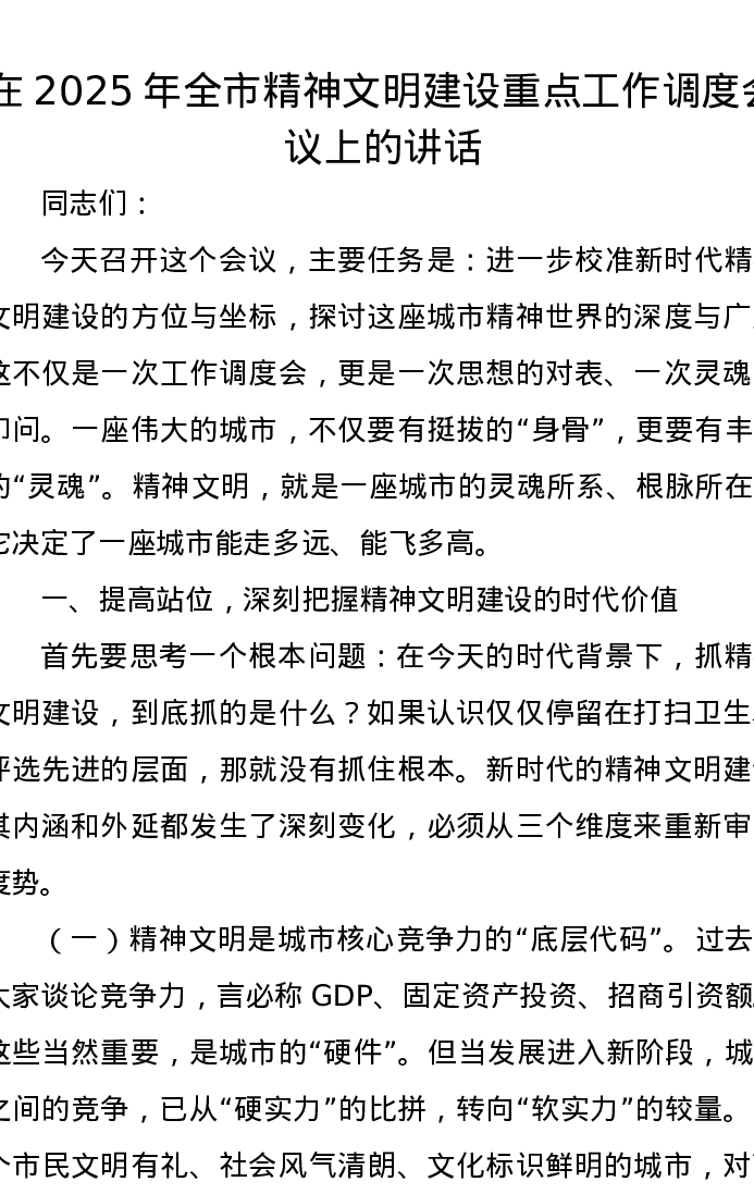 在2025年全市精神文明建设重点工作调度会议上的讲话