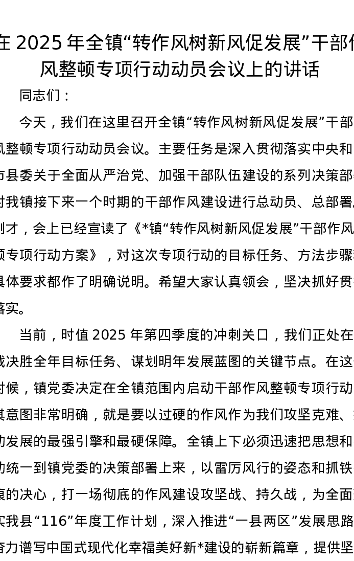 在2025年全镇“转作风树新风促发展”干部作风整顿专项行动动员会议上的讲话
