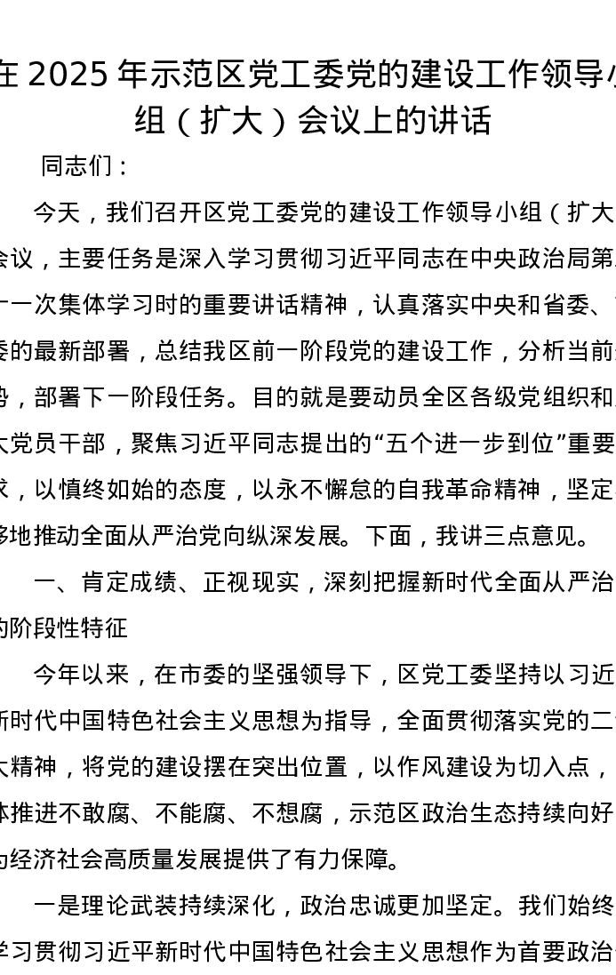 在2025年示范区党工委党的建设工作领导小组(扩大)会议上的讲话