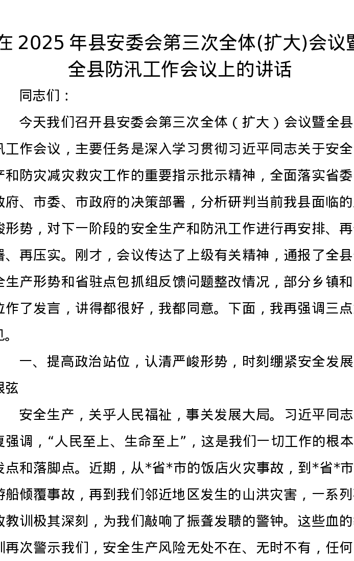 在2025年县安委会第三次全体(扩大)会议暨全县防汛工作会议上的讲话