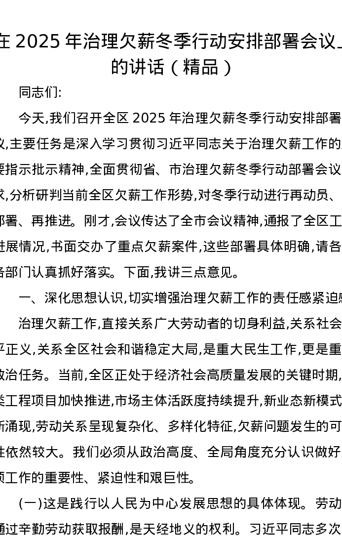 在2025年治理欠薪冬季行动安排部署会议上的讲话(精品)